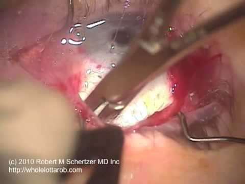 The advantage of this technique using the mini neuropatties is that this allows for posterior application of the mitomycin; in keeping with the current preferred technique. With such a posterior application over a very large area, we can achieve very low and diffuse blebs instead of the small, high blebs that overhand the corneal-scleral limbus and cause pain and risk infection.